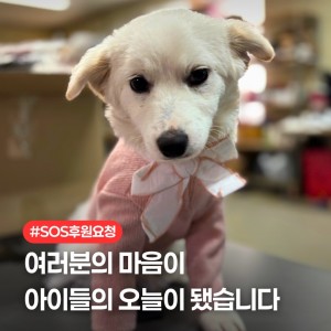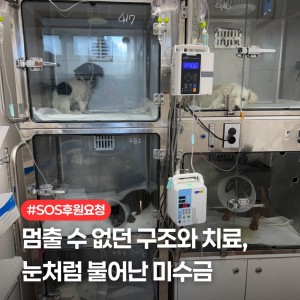 누적 병원비 후원 요청드립니다아이들을 구조할 때마다가장 먼저 향하는 곳은 늘 병원입니다.구조된 아이들 대부분은 이미 몸이 많이 상해 있거나,치료를 미뤄온 흔적들로 가득해바로 검진과 입원이 필요한 경우가 많습니다.그렇게 한 아이 한 아이를 살리기 위해 …