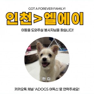 ♧ 미국 엘에이 이동봉사자님을 찾습니다 ♧♧ 민디가 입양처로 갈 수 있도록 도와주세요♠ 이동 날짜 조율 가능♠ 해외이동봉사 시 부담하실 개인 비용은 일절 없습니다!♠ 출국 당일 담당 스텝이 공항에 동행하여 수속 도와드립니다!♠ 강아지 켄넬과 개인 수화…