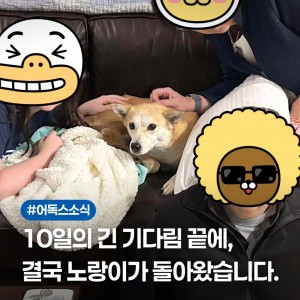 10월 24일 유실됐던 노랑이가입양자님들의 노력 끝에 드디어 집으로 무사히 돌아왔습니다.열선 드론으로 하늘에서 수색하고,가족분들은 하루하루 목격 제보 지역을 발로 뛰며 찾아 헤매셨어요.이웃집 마당을 들락날락하던 노랑이는포획틀에는 들어가지 않았지만, 끝…